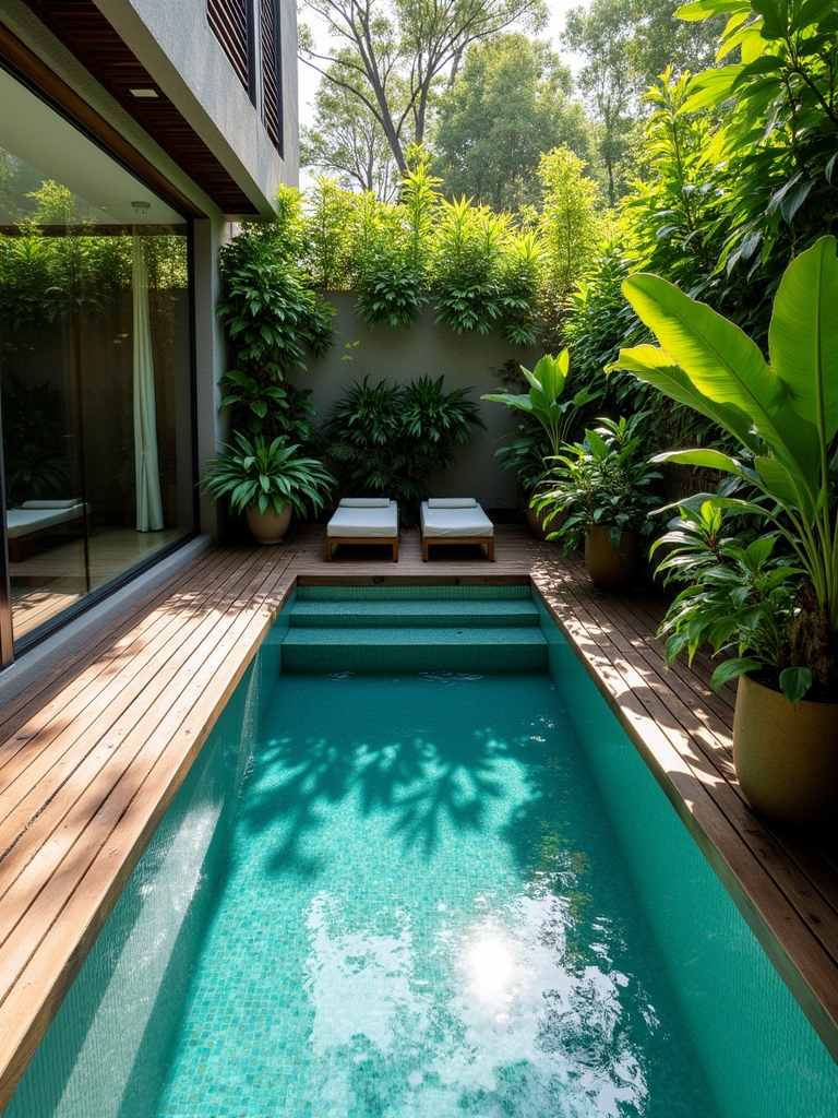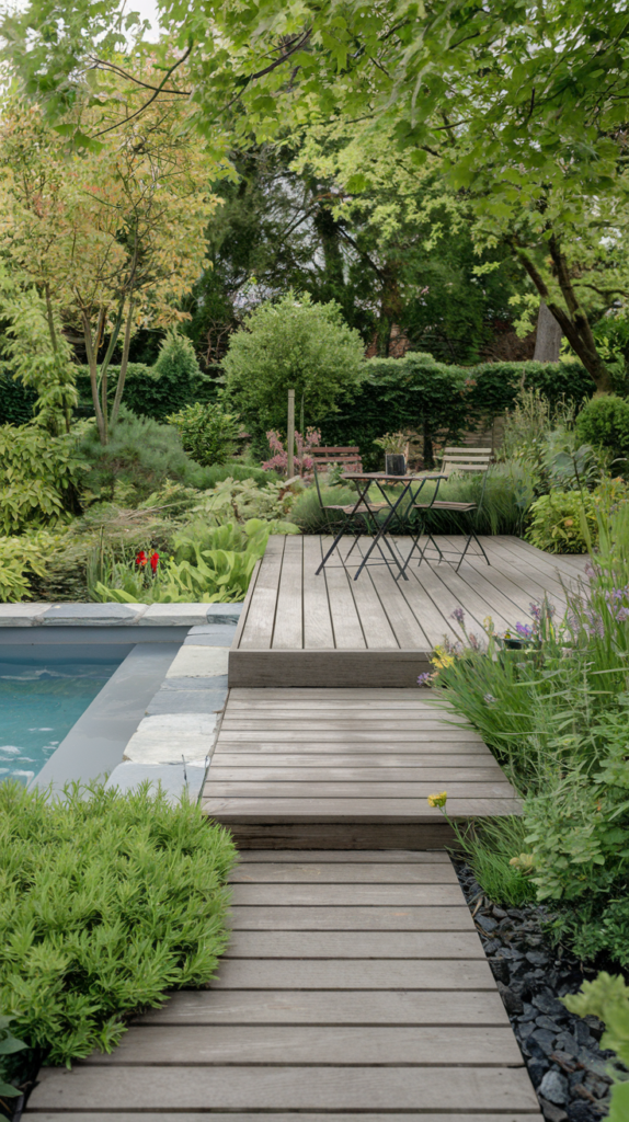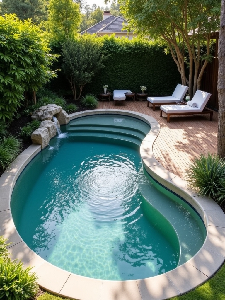 This is a true “secret garden” pool. Its natural, curved shape and seamless blend with the wooden deck are the first things that catch your eye. I can almost hear the sound of water cascading over small rocks. This place is better suited for relaxing with a book and experiencing a Zen-like retreat than for swimming. The lush greenery also provides the perfect amount of privacy. It’s the perfect place for those seeking peace.