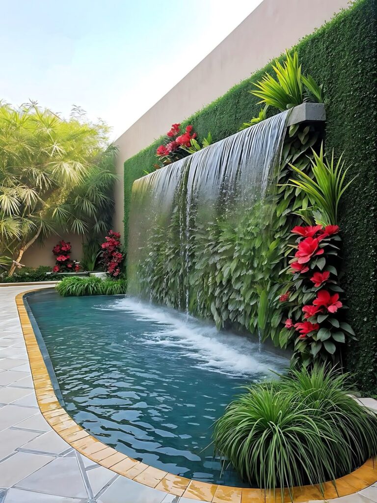 Wow! The star of this pool isn’t the water itself, but the massive waterfall wall. Together with the vertical garden, it creates a living picture. The sound of flowing water washes away all environmental stress. The red flowers contrast dramatically with the greenery, adding a touch of luxury to the space. Just watching it is therapeutic.