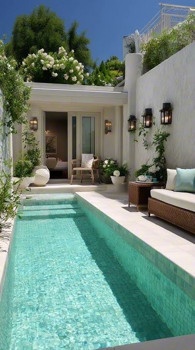 With its pure white walls, bright turquoise mosaics, and classic lantern-style wall sconces, this pool looks like it was plucked from an Aegean island. This pool looks like it was plucked from an Aegean island. Its narrow, elongated shape shows that even the smallest spaces can be transformed into a refreshing oasis. It’s the perfect place to cool off by dipping your feet in the water before escaping into the cool room during the hottest hours of the day.