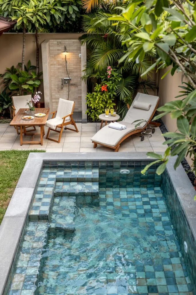 Here’s an “all-inclusive” backyard design! It includes a small plunge pool, an outdoor shower next to it, a two-person dining table, and a lounge chair. What else could you possibly need? The dark tiles in different shades add depth to the water. This space may be small in square footage, but it’s enormous in terms of quality of life.