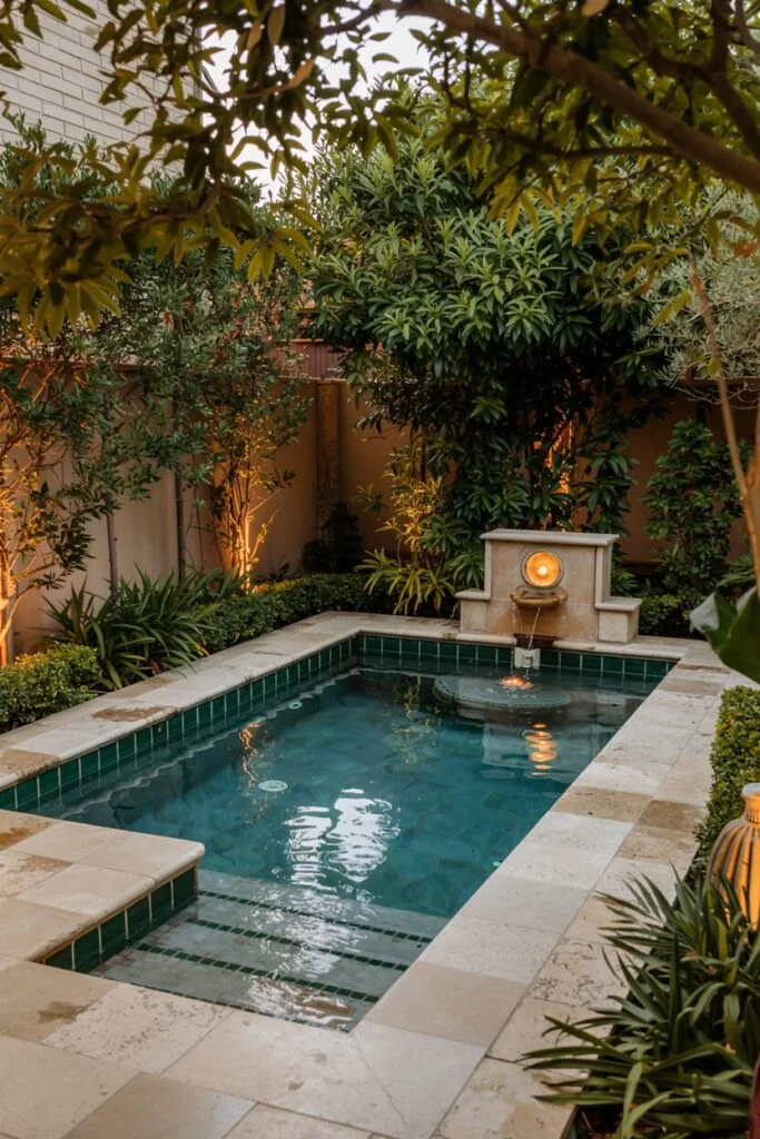 The evening lights are on, casting a soft glow through the trees and illuminating the classic fountain on the wall. This place resembles an Italian courtyard more than a pool. The warm texture of the travertine stones and the ripples on the water create an incredibly romantic and serene atmosphere.