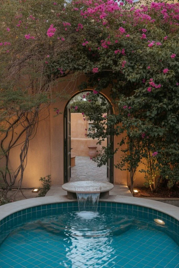 This place must have come straight out of a fairy tale! You pass through an arched doorway into another courtyard, and from there, you reach a small pool. The sound of water flowing under the archway is soothing. Not to mention the magnificent bougainvilleas that cover everything! When the evening lights come on, the place transforms into a magical portal.