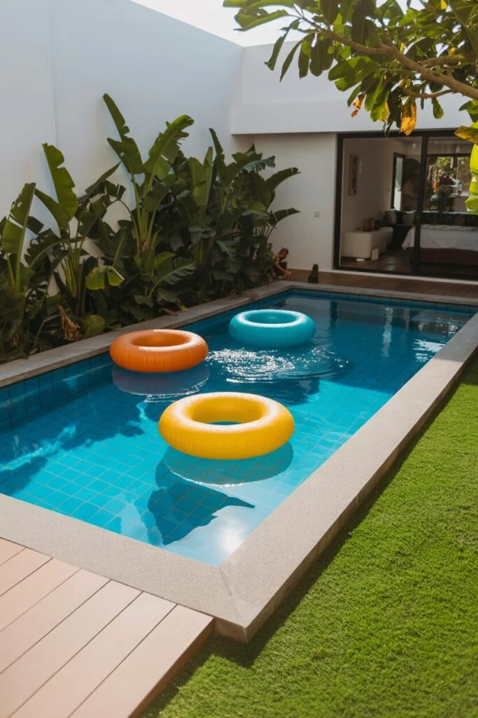 Here’s what “vacation mode” looks like! It’s colorful donuts, a bright blue pool, lush green plants, and a door that opens directly into the bedroom. This is a space far removed from seriousness, entirely focused on enjoyment. Size doesn’t matter; what matters is how much fun you have in the water. The minimalist structure has been transformed into a complete playground with colorful accessories.