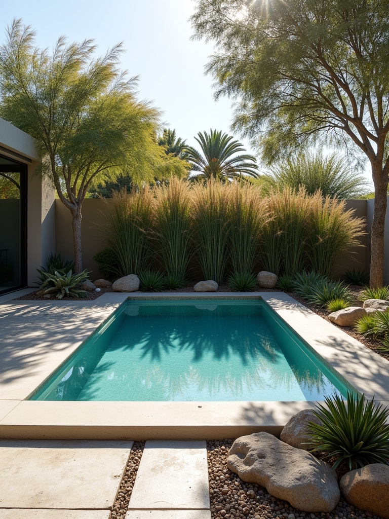 This is a truly minimalist and striking design. It features sharp lines, a neutral concrete floor, and desert plants. This pool is the perfect cool oasis in the heat. The bright blue water under the sun creates a striking contrast as the long, feathery plants sway in the wind. It’s a perfect design for those who love modern architecture and the raw beauty of nature.