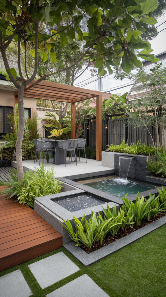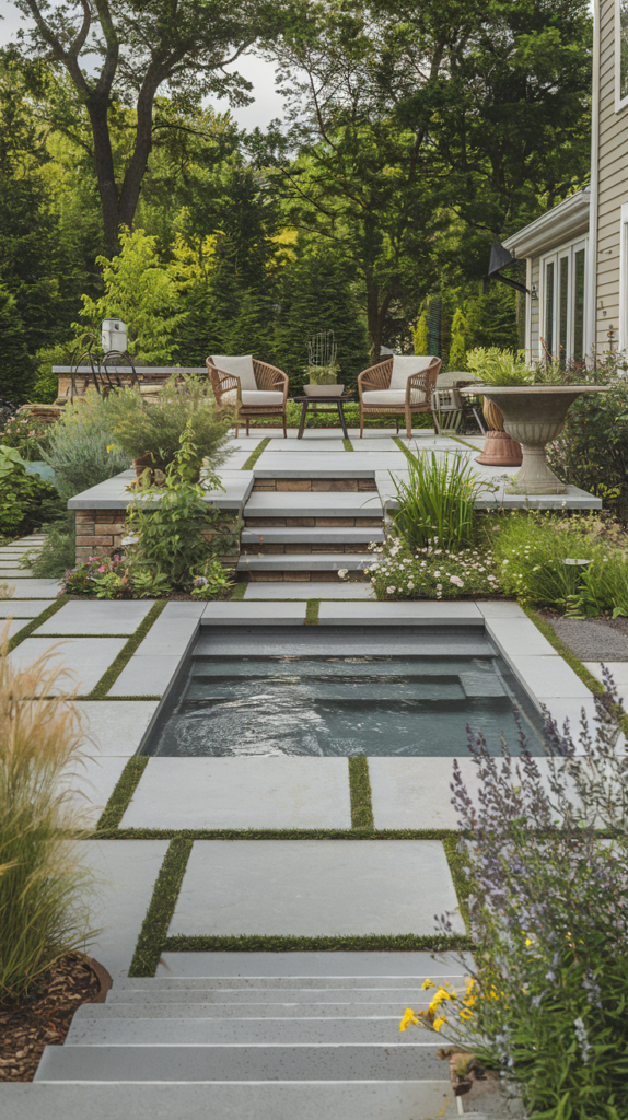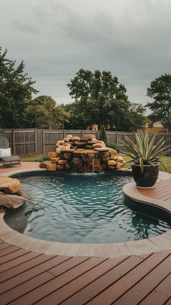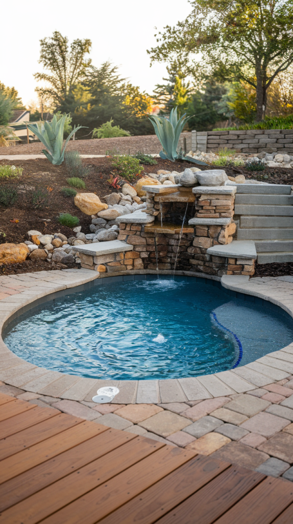 This is one of the most beautiful ways to take advantage of sloping terrain. There’s a wooden deck, a small spa/pool area one level below, and stairs that continue up the hill. The focal point is the waterfall that cascades down the layered stone wall. The different levels and materials—wood, stone, and earth—blend together beautifully.