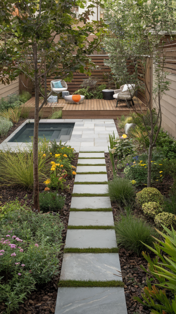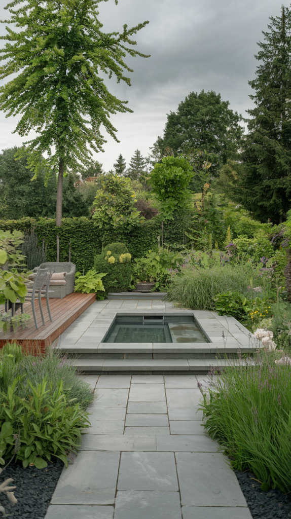 The fate of narrow, long gardens is changing! This design is a lesson in “depth perception.” The stone path leads to a relaxation area with a wooden veranda at the far end of the garden. As you walk, the small plunge pool on your left beckons you with the promise of refreshment. The flowers and plants are so abundant that the journey is as enjoyable as the destination.