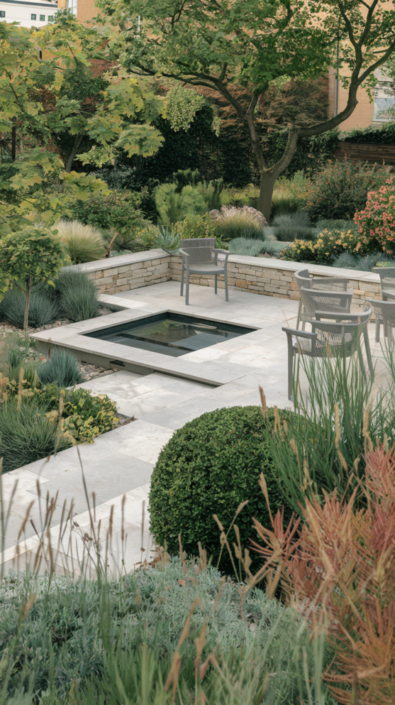 There is a disciplined approach to landscaping here. The terrace is surrounded by stone walls and minimalist chairs. The square pool and jacuzzi sit like jewels in the middle. The real highlight, though, is the surrounding vegetation. Rather than a classic English lawn, it is filled with ornamental grasses, lavender, and shrubs, creating a wild yet controlled aesthetic.