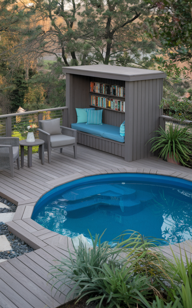 This is one of the best ideas I’ve ever seen! Yes, there’s a small, circular pool, also called a cocktail pool, but that’s not the real star. The real star is the incredible reading nook integrated into the deck. It’s a sanctuary with a roof, shelves full of books, and plenty of cushions. When you’re tired of swimming or just want to hear the sound of the water, this is where you retreat. It’s incredibly enjoyable!