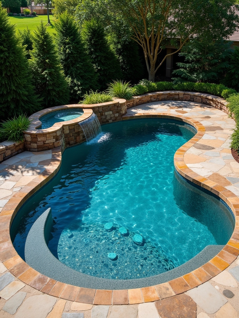 This isn’t just a pool; it’s practically a personal water park! It has an integrated Jacuzzi, a waterfall flowing from the Jacuzzi into the pool, and seating areas in the water. This pool is designed for “fun and relaxation.” Stone cladding and a curved design give it a natural feel, and its features take luxury to new heights. It’s a must-have for parties.