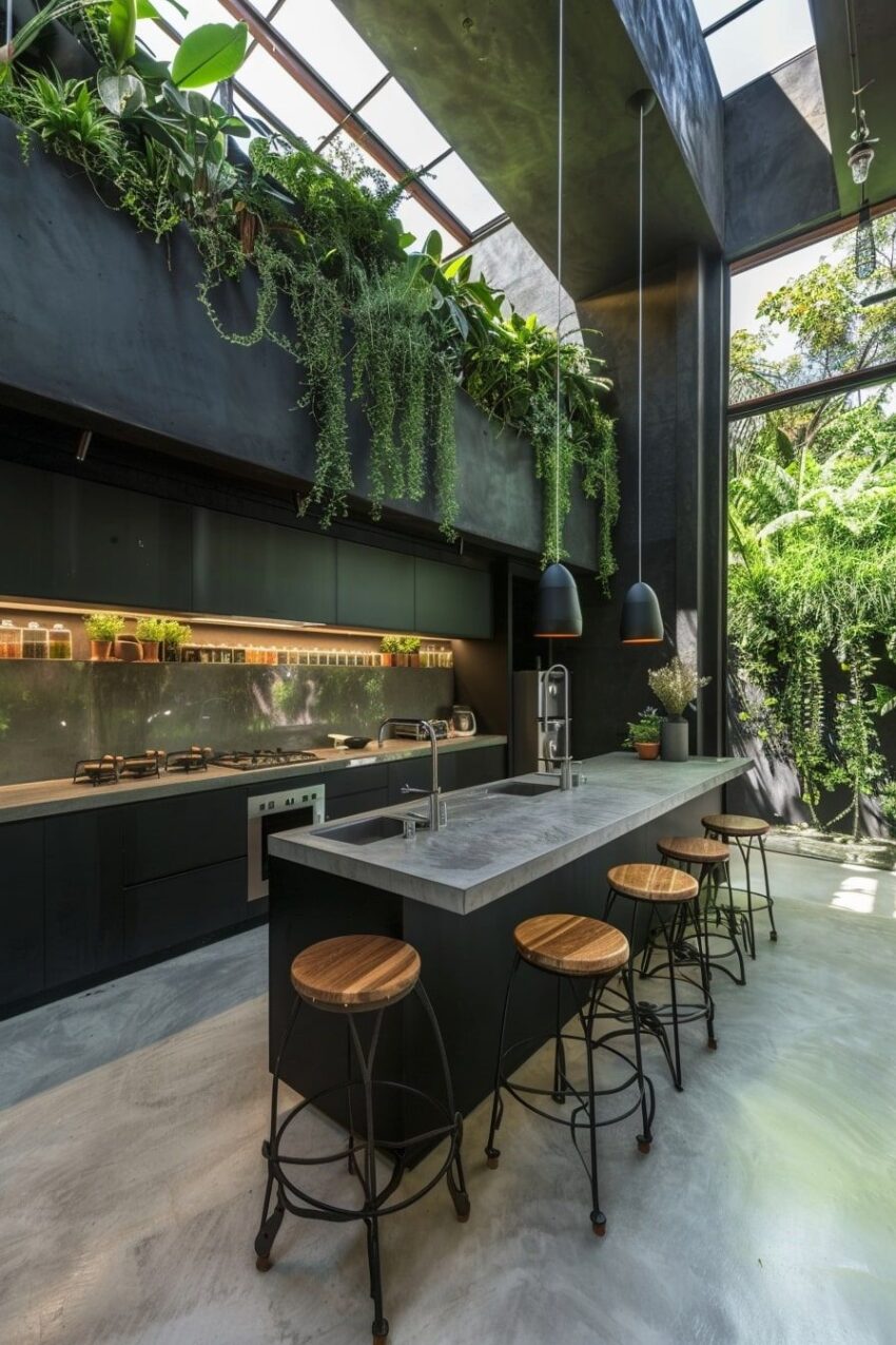 This kitchen is a captivating blend of industrial chic and tropical serenity that redefines indoor-outdoor living. Sleek, dark cabinetry and polished concrete countertops provide a modern, minimalist foundation. However, the true star of the show is the lush, cascading greenery. Plants spill from a high-level planter and climb the walls, creating an “urban jungle” atmosphere that is simultaneously calming and invigorating. A massive skylight and floor-to-ceiling windows bathe the space in natural light, blurring the boundaries between the interior and the vibrant garden beyond.