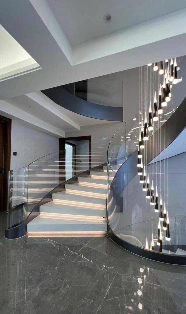 The central focal point is the elegant, curved staircase with illuminated steps that appear to float effortlessly through the space. The transparent glass balustrade maintains an open and airy feel, allowing the eye to follow the beautiful lines of the structure. A dramatic, spiraling chandelier with downward-pointing lights adds a touch of modern art, filling the high-ceilinged space with a warm, ambient glow. Dark, polished marble floors and a simple, curved railing above the staircase complete the look, creating a sense of sophisticated grandeur.