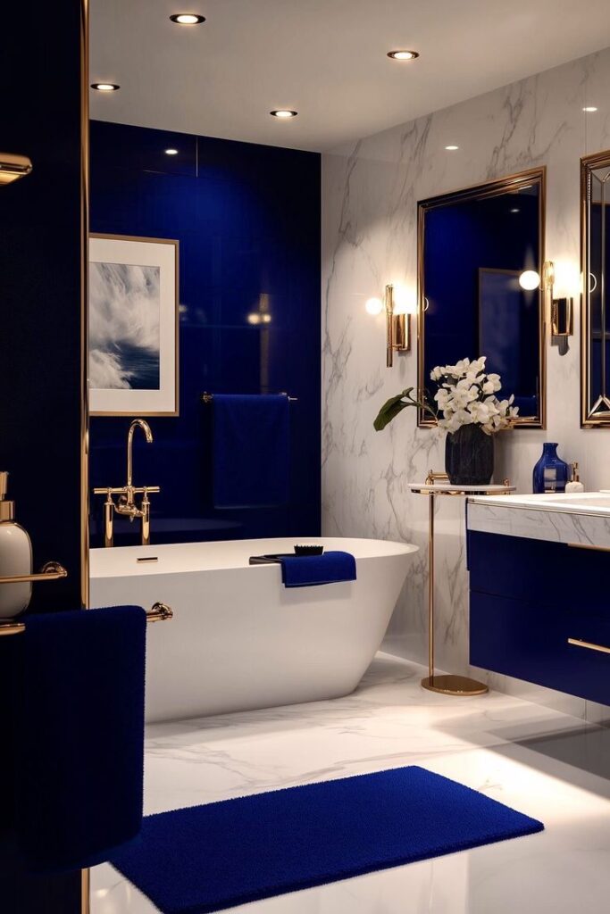 The design is a masterful study in contrasts. A bold, high-gloss sapphire blue wall serves as a powerful focal point. This deep, rich color is beautifully complemented by the classic elegance of white marble on the surrounding walls and floor, achieving perfect balance. However, the true magic lies in the use of gold accents. From the sleek fixtures and ornate mirror frames to the delicate side table, the gold accents add a touch of pure luxury and warmth, elevating the entire space. The freestanding white tub is a serene centerpiece that invites you to relax and unwind.