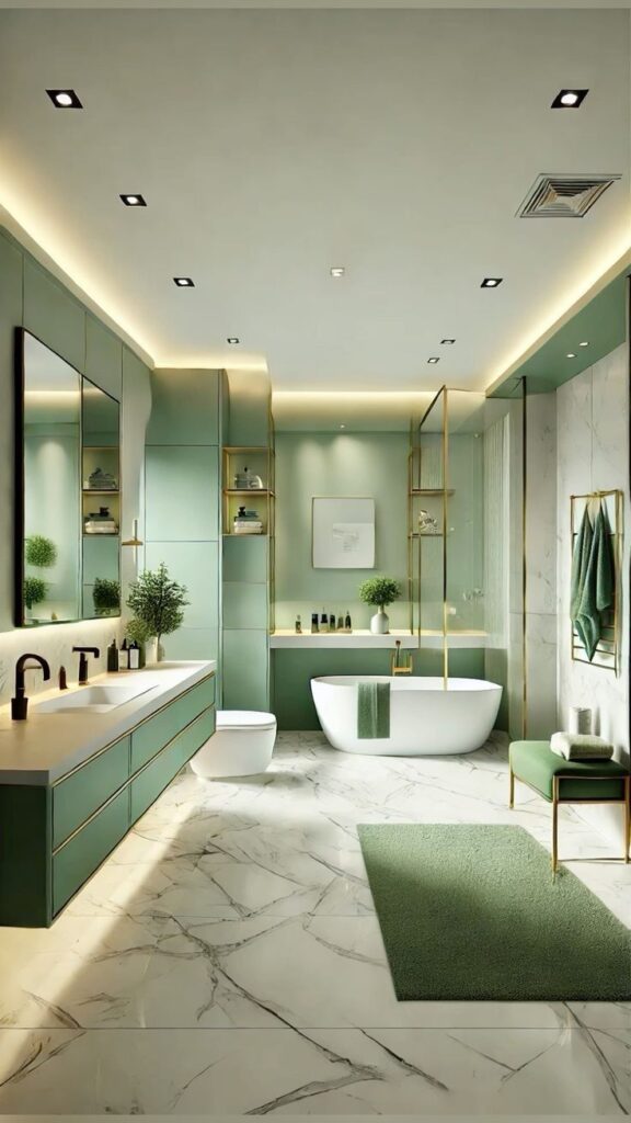The primary color, a beautiful shade of sage green, offers a refreshing alternative to traditional white and creates a spa-like atmosphere. It is used on the sleek double vanity and one accent wall, providing a gentle yet sophisticated backdrop. Gold accents are strategically placed throughout the design, from the shower frame and open shelving to the towel rack, adding a touch of timeless glamour. The white marble floor and walls with subtle gray veining keep the space feeling bright and expansive. Thoughtful lighting, including warm LED strips and recessed lights, enhances the serene ambiance.