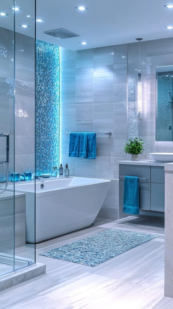 This bathroom is a stunning example of how cool tones and thoughtful lighting can transform a space into a serene, spa-like retreat. The space is anchored by a calming palette of light grays and brilliant blues. The showstopper is the vertical feature wall adorned with shimmering blue mosaic tiles. A hidden LED strip dramatically illuminates the wall, casting a futuristic glow. This vibrant focal point is balanced by large-format light gray tiles on the floor and walls, which provide a clean, modern backdrop. The freestanding tub, glass shower enclosure, and simple vanity maintain a sleek, minimalist aesthetic. Coordinated blue towels and a bath mat add softness and reinforce the calming aquatic theme.