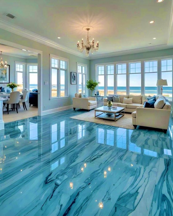The most captivating feature is the stunning, highly polished floor with swirling turquoise and white patterns that perfectly mimic the movement of waves. The floor reflects abundant natural light and creates a seamless connection to the panoramic ocean view outside the large windows. The rest of the space is a study in calm, coastal elegance. Pale blue walls, plush cream-colored sofas, and a classic chandelier create a serene atmosphere, allowing the vibrant floor and stunning ocean view to take center stage. The design masterfully blurs the lines between indoor and outdoor spaces, creating a home that is both a sophisticated sanctuary and a celebration of its incredible natural surroundings.