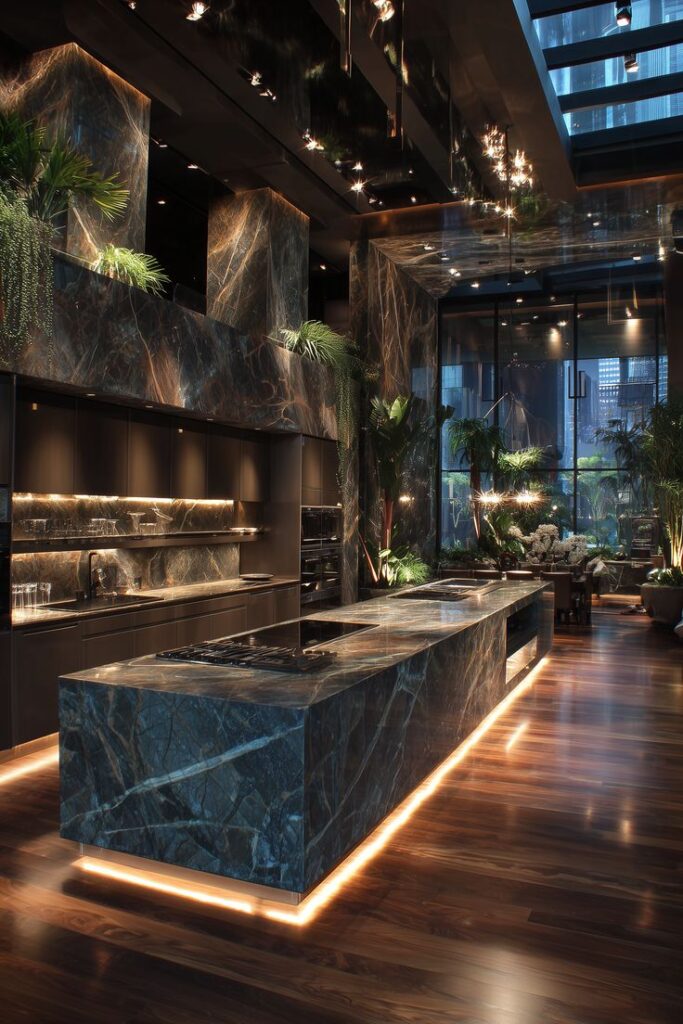 A magnificent island and walls clad in dramatic, dark-veined marble anchor the space, exuding sophistication. The reflective ceiling makes the already high ceilings feel even more expansive, adding to the grandeur. However, it is the strategic integration of greenery that truly elevates this design. Lush tropical plants soften the hard lines of the stone, adding a touch of life and vibrancy to the room.