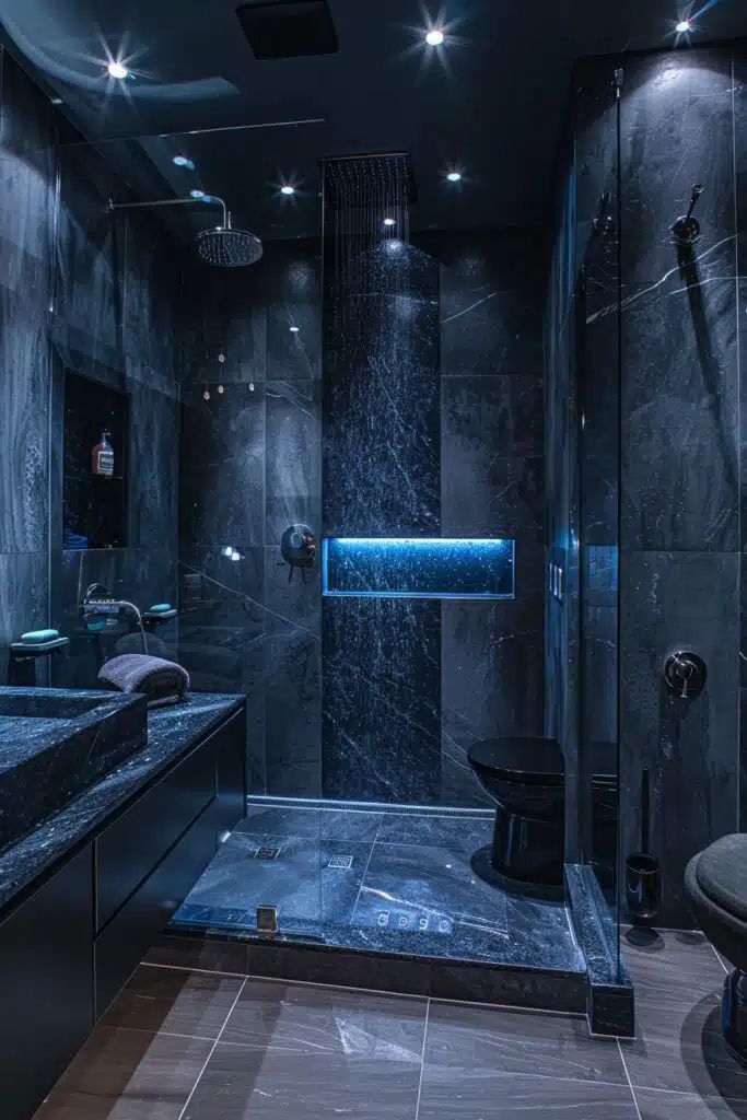 The sleek, all-black fixtures, from the toilet to the sink, blend into the design, allowing the stone’s textures to take center stage. Lighting plays a key role here: pinpoint spotlights create a celestial effect, and a blue-lit niche in the shower adds a futuristic, spa-like touch. The waterfall showerhead and glass enclosure further enhance the high-end spa experience.