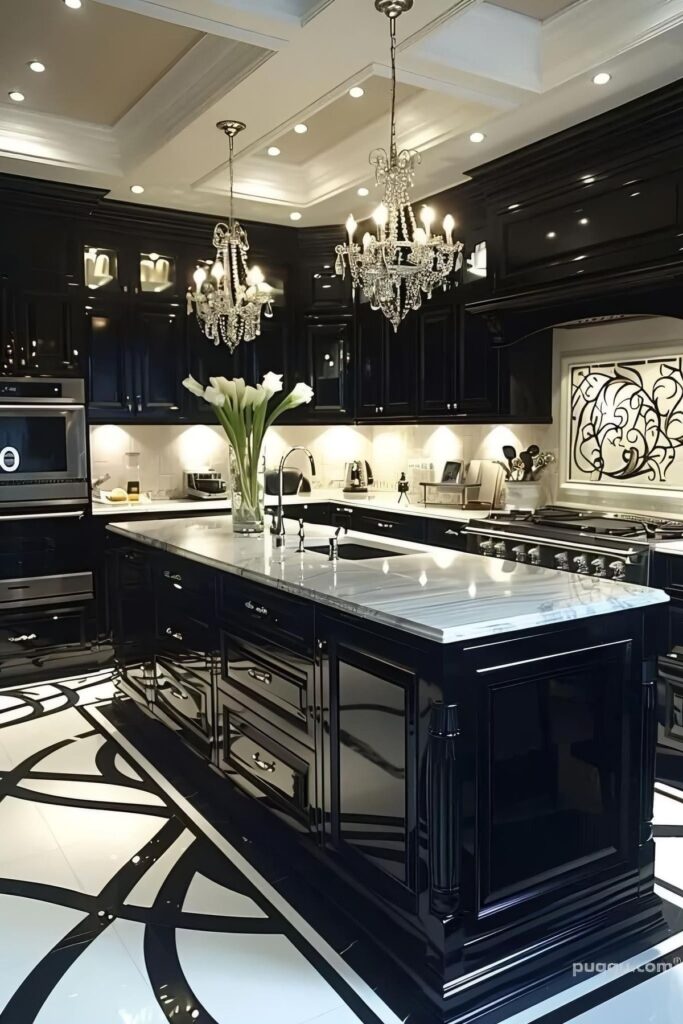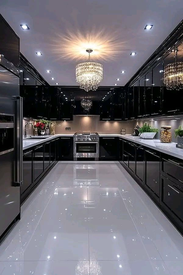 The space is a brilliant study in contrast and reflection. Glossy black cabinetry makes a powerful, luxurious statement. The polished white floor and countertops provide a crisp, clean contrast, making the room feel bright and spacious despite the dark color scheme. A dazzling crystal chandelier is the centerpiece, cascading light and instantly elevating the entire design with a touch of timeless elegance. Recessed lighting and under-cabinet LEDs ensure the space is always brilliantly illuminated, showcasing the flawless reflective surfaces.