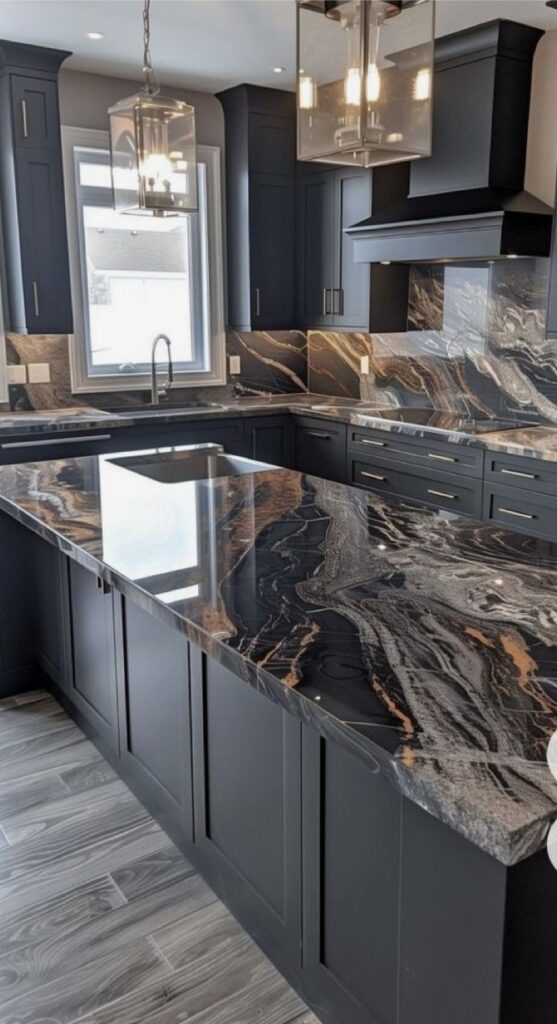 The stone’s rich, reflective surface contrasts beautifully with the muted cabinetry, creating a balanced and visually engaging space. Simple yet elegant pendant lights and brushed metallic hardware add a final touch of sophistication. This kitchen exemplifies how bold design choices, when executed precisely, can result in a timeless and unforgettable space. It’s the perfect blend of modern simplicity and raw, natural beauty.