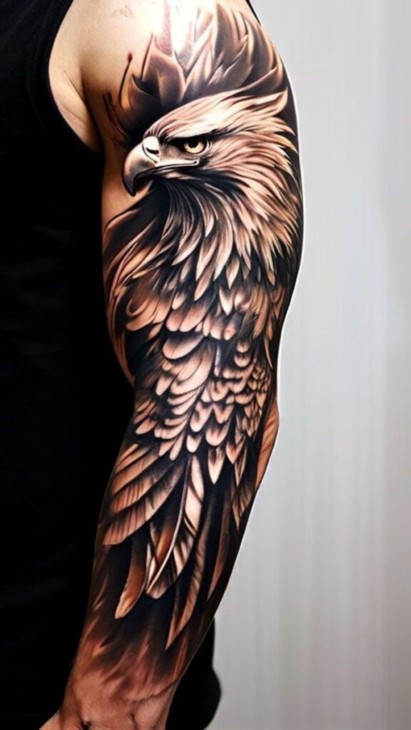 A spread-winged eagle represents freedom, power, and high ideals. The realistic feathers and sharp gaze in this tattoo show how carefully the artist worked on it. Eagle tattoos are a great choice for people who are set on achieving their goals.