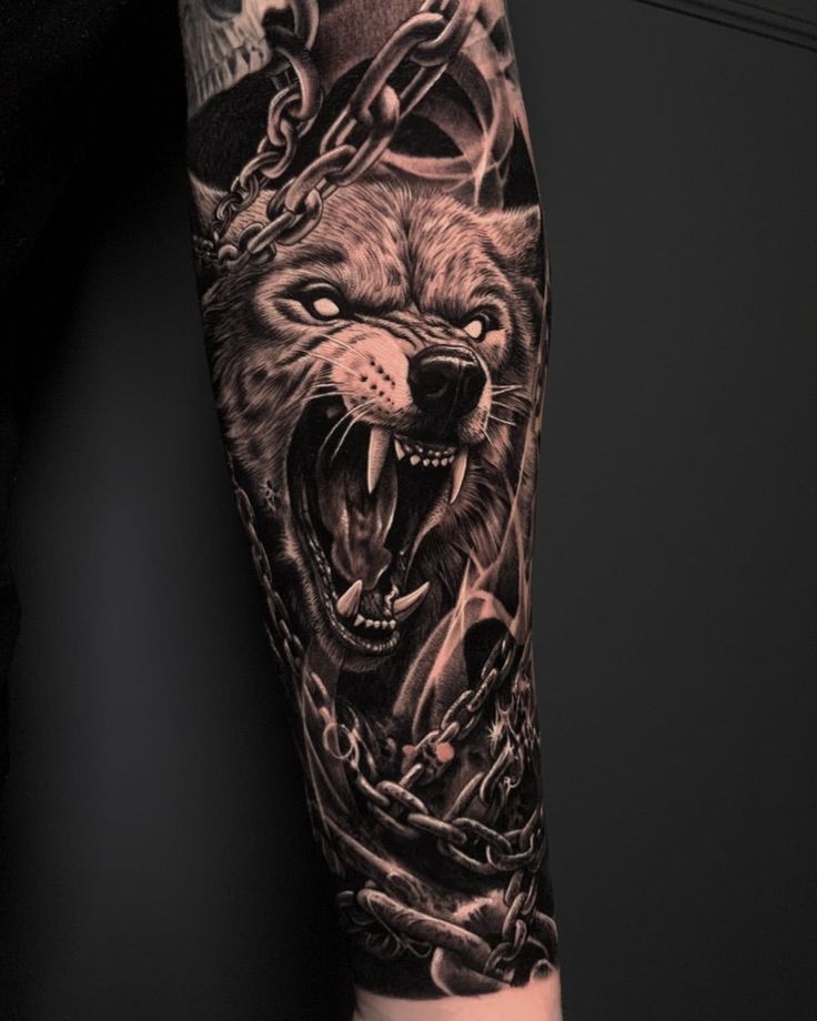 Wolves symbolize loyalty, fidelity, and the wild. These tattoos feature peaceful and aggressive wolf faces. One tattoo shows a howling wolf under a full moon, representing loneliness and power. Another features a chained wolf, symbolizing anger and desire for freedom. Wolf tattoos are for nature lovers.