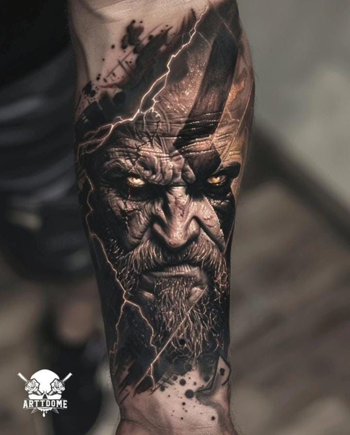 These tattoos are inspired by mythology and legends. A face surrounded by lightning bolts can represent divine power or an inner storm. Tattoos like this one have deep meanings and powerful images. They are both works of art and a way to express who a person is.
