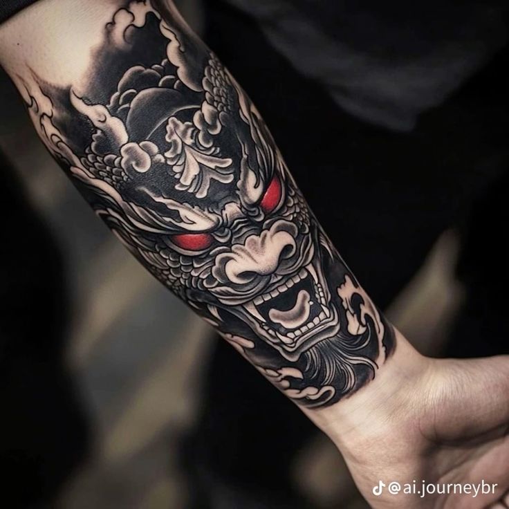 These tattoos draw from Japanese mythology and samurai culture. The red details and scary masks show the bold and warrior spirit of these tattoos. The artist’s use of shading and composition skills makes each piece a storytelling work of art.