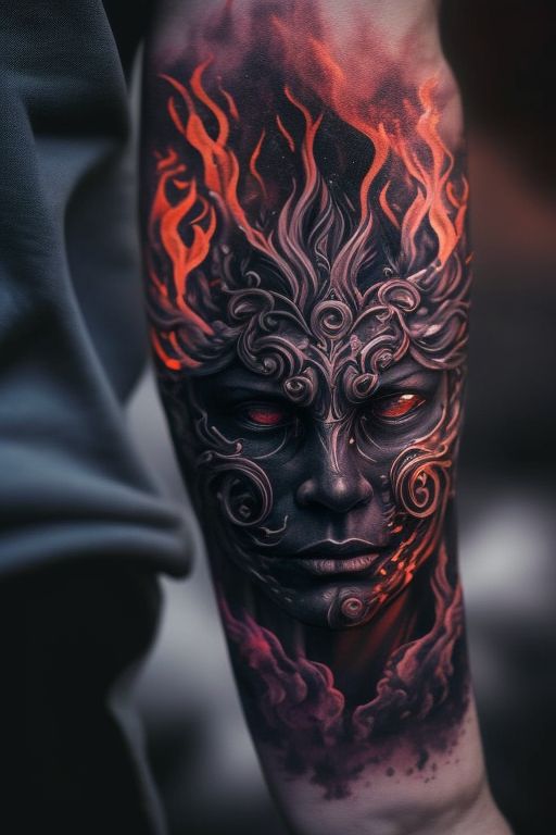 17) Fire and Passion: Mask and Flame Tattoo