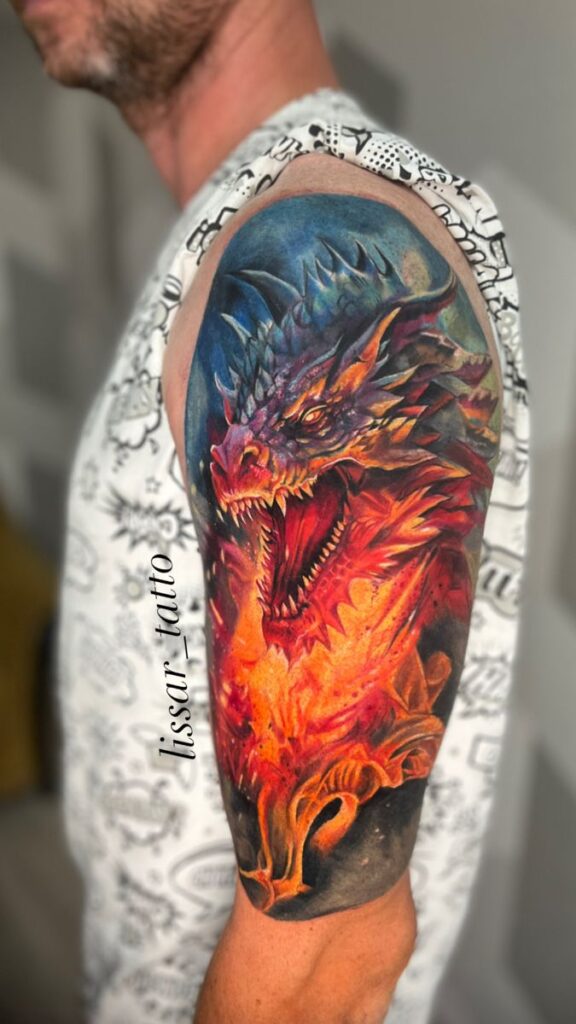 This tattoo shows the dragon’s reign and power. The bright yellow and orange eyes make the tattoo stand out. The dragon’s skin texture and the smoke details around it make the artwork look more realistic.