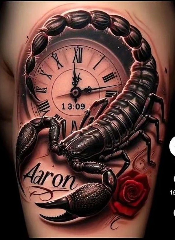 This tattoo combines the scorpion, a powerful symbol, with a clock. This references ideas about how time repeats itself and how life is fragile. The shading of the tattoo makes the scorpion look like it has three dimensions, and the red rose detail makes the design look more romantic.