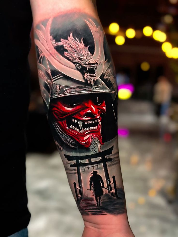 These tattoos, inspired by samurai culture and Japanese mythology, feature bold, red details and masks reflecting the warrior spirit. The artist’s skills transform each piece into a storytelling work of art.