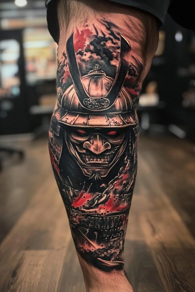 This tattoo represents the warrior spirit and discipline of a samurai. The small details on the mask and armor show how careful the artist was. Samurai tattoos represent important values like honor, courage, and loyalty. This tattoo is more than just a picture; it shows the person’s strong commitment to these important values.