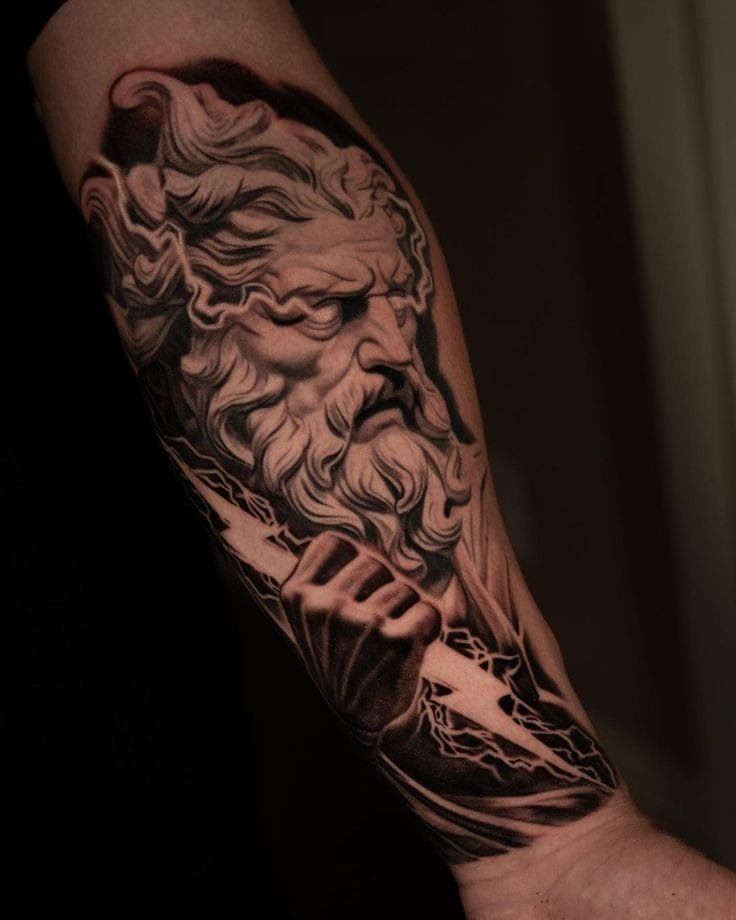 It brings the elegance and power of Greek sculpture to a modern tattoo design. This piece on the arm is absolutely amazing. Just look at all the incredible details, from the wrinkles on Zeus’s face to every wave in his beard. It’s almost like an ancient marble sculpture has come to life on your arm. The lightning bolt he holds so dear in his hand reminds us that he is not just a god, but also the absolute ruler of the skies and storms. The monochrome color palette is like a warm embrace, making the piece feel classic and timeless.