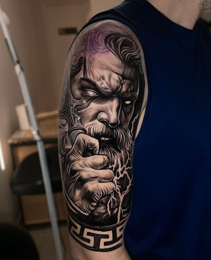The moment Zeus holds the lightning bolts in his palm is depicted in a striking monochrome style. The way Zeus’s face looks so serious and his hands are holding the lightning bolts makes the tattoo look so powerful. The use of black and white tones brings out the sharp contrasts of light and shadow, giving the figure a sculptural depth. The geometric pattern on the lower part of the arm adds an artistic touch to the design, referencing classical Greek motifs.